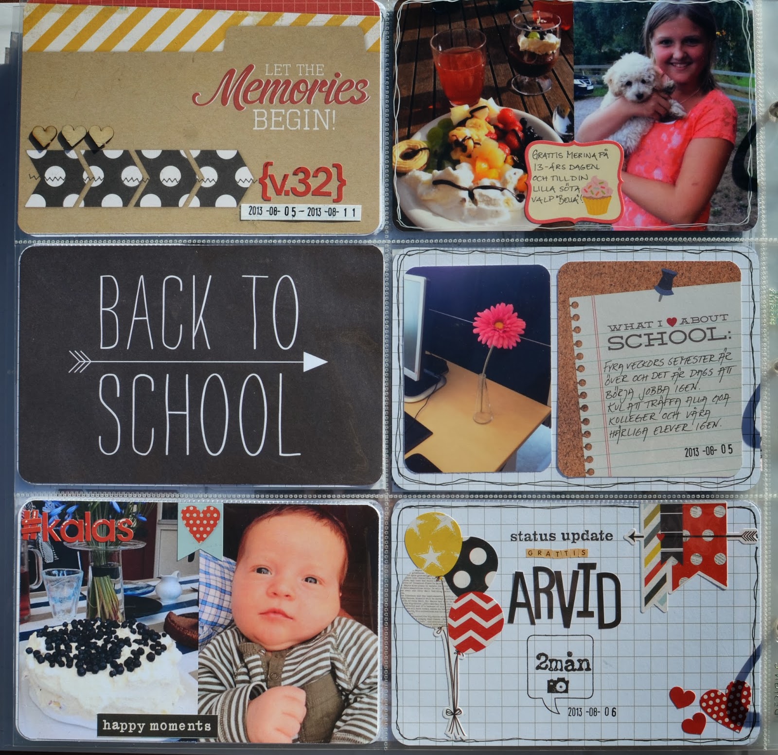 Vecka 32 är scrappad och klar och snabbar jag på lite så är jag snart ikapp med mina veckor. Flera undrar hur jag får tid över till att scrappa i mitt för övriga ganska hektiska liv med jobb, barn och häst och det undrar jag också ibland. Men jag har ett skrivbord där jag låter uppslaget ligga och med korta besök och snabbscrapp varje dag så växer veckan fram. Det är verkligen lyx att slippa packa ihop efter varje scraptillfälle och sen packa upp igen. Det svåraste är att bestämma sig för vilka foton som ska få representera veckorna tycker jag.